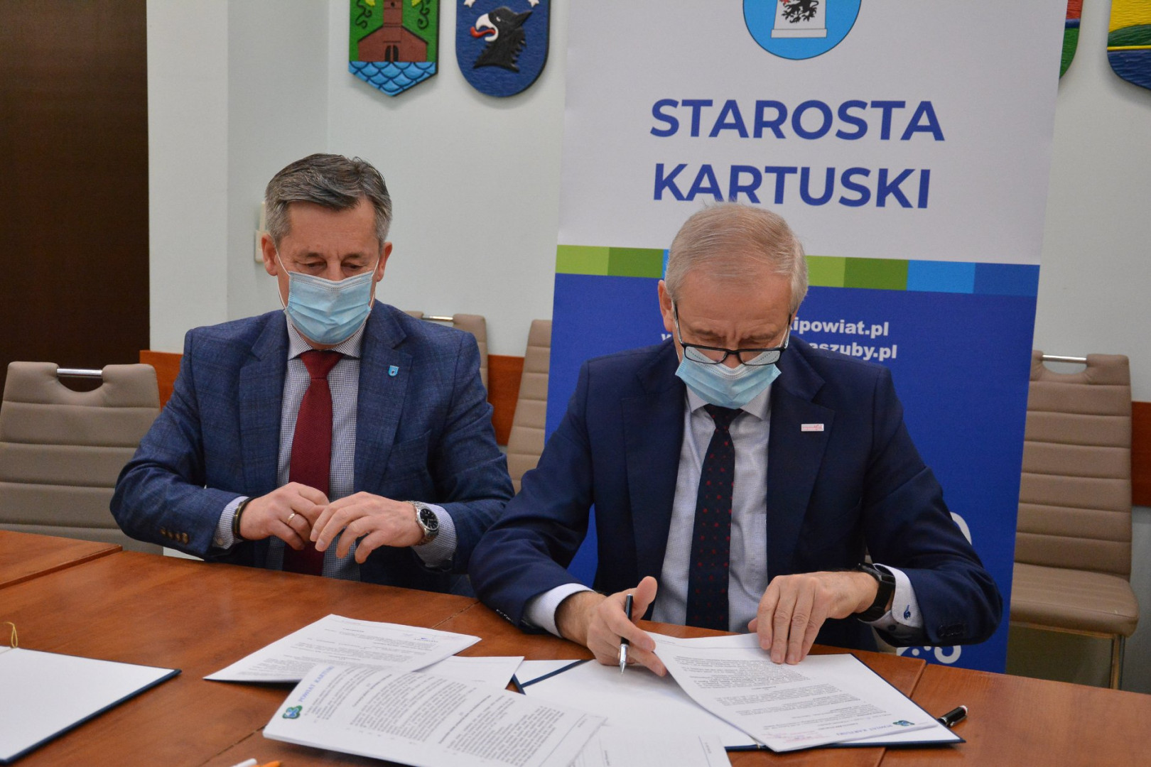 W siedzibie Starostwa Powiatowego w Kartuzach Starosta Kartuski Bogdan Łapa wraz z Wicestarostą Piotr Fikus podpisali umowy z wykonawcą – Zakładem Instalacji Elektrycznych Edmundem Cirockim z Żukowa, na modernizację 16 przejść dla pieszych na drogach powiatowych.