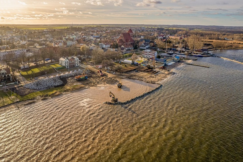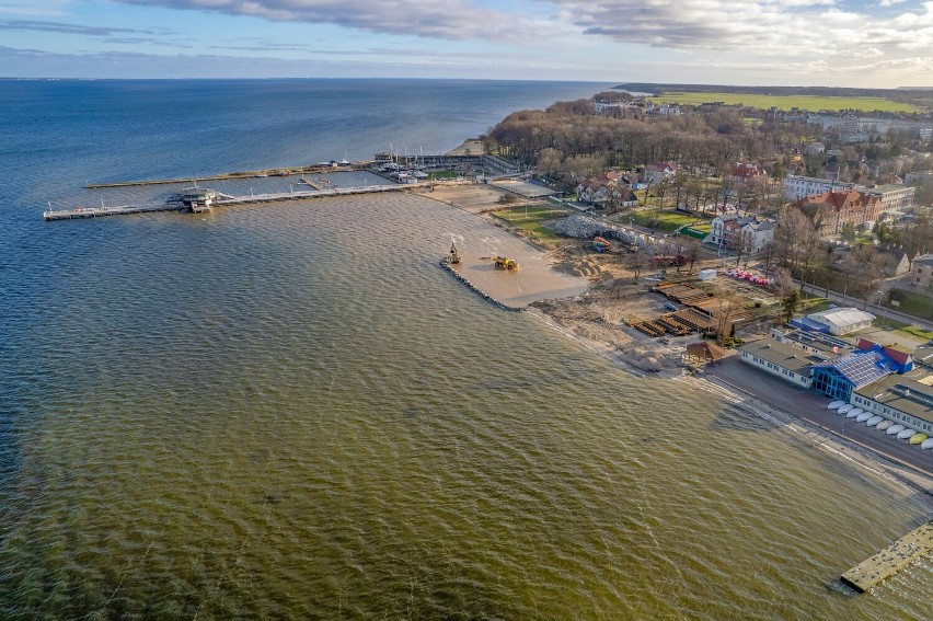Roboty na lądzie - te widoczne gołym okiem - ruszyły pod koniec ubiegłego roku, gdy odgrodzono część plażowego terenu w Pucku, a na brzegu pojawiły się hałdy gruzu i kamieni. Teraz, w styczniu 2022 sprzęt wreszcie wkroczył do wody.