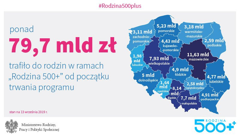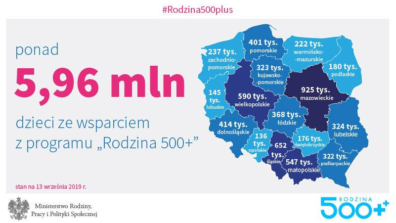 Program "Rodzina 500 plus " wszedł w życie 1 kwietnia 2016 roku i przyczynił się do znacznej poprawy sytuacji materialnej rodzin, wzmocnił je i nadał należny priorytet. W 2015 roku łączne wydatki budżetu państwa na rzecz rodzin wyniosły 1,78 proc. Produktu Krajowego Brutto. W 2017 roku wyniosły one już 3,11 proc. PKB. Jest to wzrost o 75 proc.