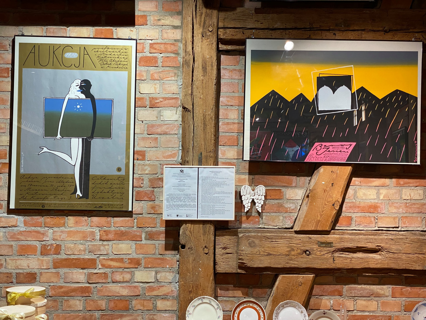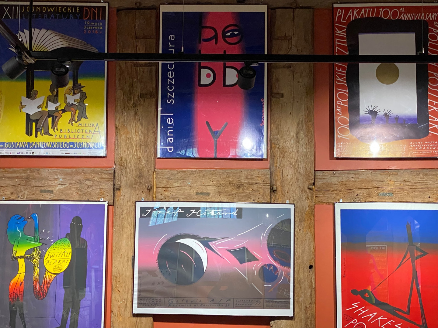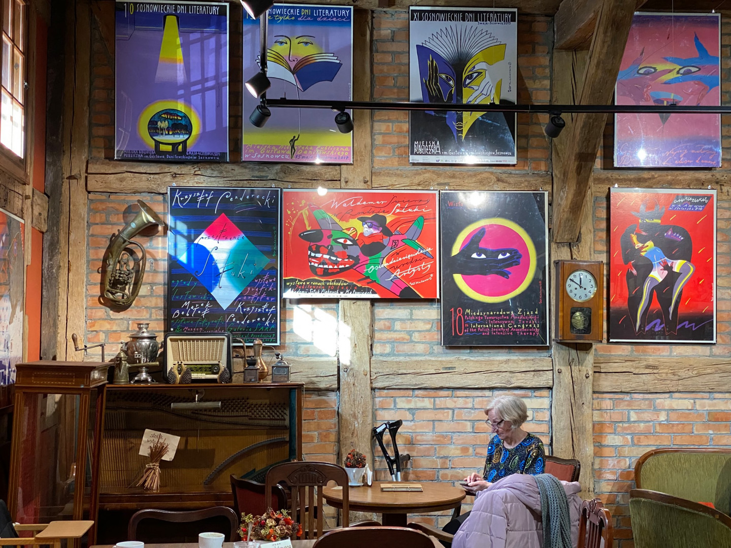 Herbaciarnia w Spichlerzu Richtera, wystawa XXVI edycji Polskiej Szkoły Plakatu, tym razem prace klasyka Romana Kalarusa.