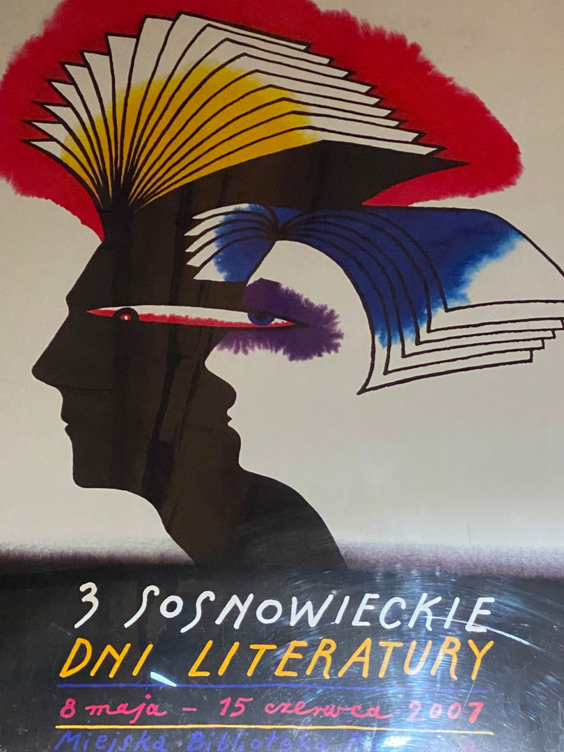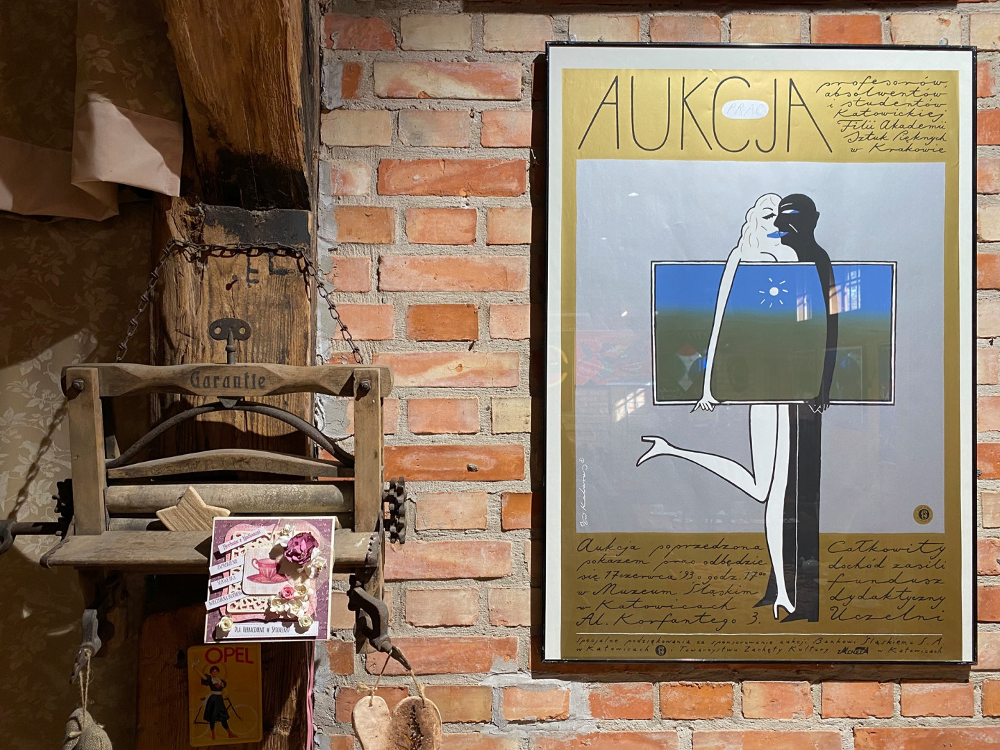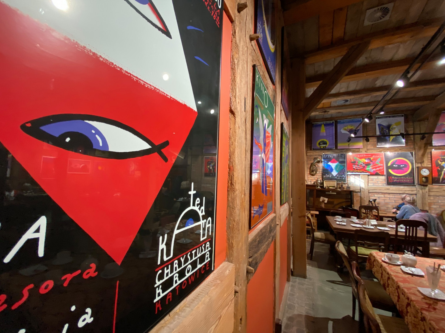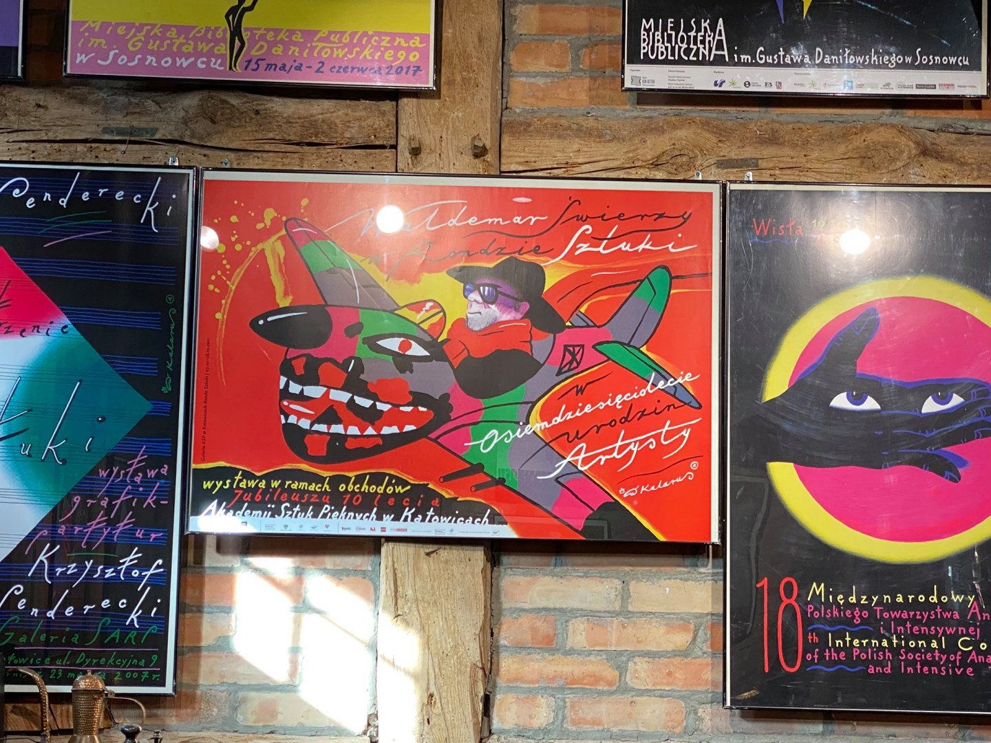 Herbaciarnia w Spichlerzu Richtera, wystawa XXVI edycji Polskiej Szkoły Plakatu, tym razem prace klasyka Romana Kalarusa.
