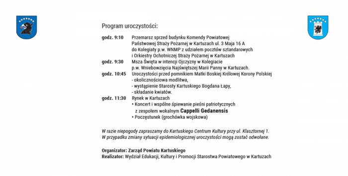 W razie niepogody koncert odbędzie się w Kartuskim Centrum Kultury. W przypadku zmiany sytuacji epidemiologicznej uroczystości mogą zostać odwołane.