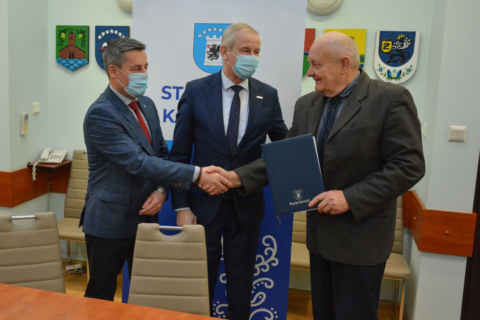 W siedzibie Starostwa Powiatowego w Kartuzach Starosta Kartuski Bogdan Łapa wraz z Wicestarostą Piotr Fikus podpisali umowy z wykonawcą – Zakładem Instalacji Elektrycznych Edmundem Cirockim z Żukowa, na modernizację 16 przejść dla pieszych na drogach powiatowych.