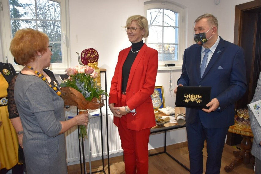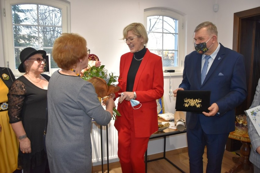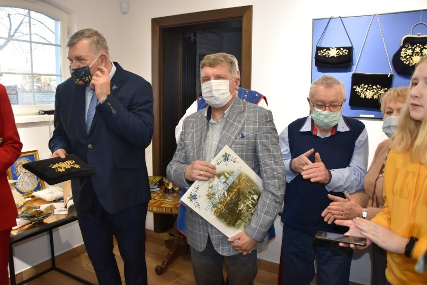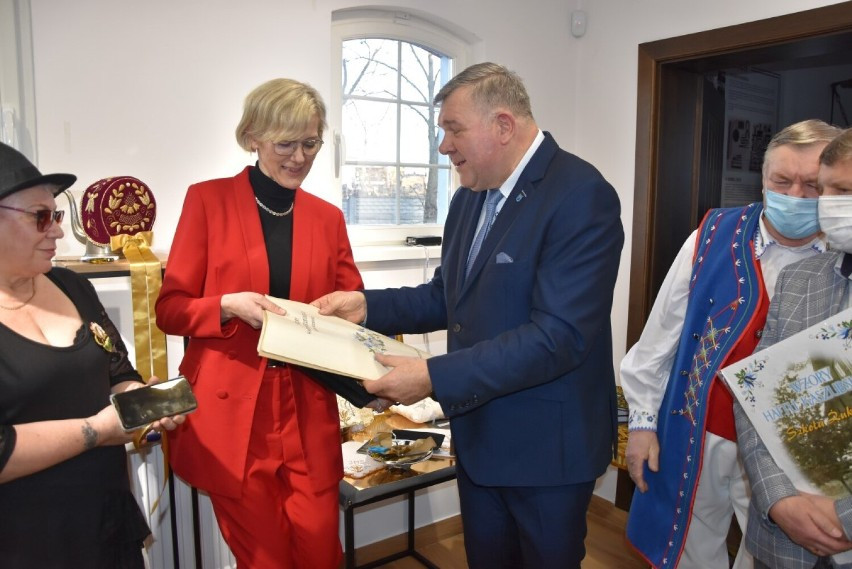 Piotr Karczewski wręczył na ręce Barbary Kąkol najnowsze wydawnictwo "Wzory haftu kaszubskiego Szkoła Żukowska".