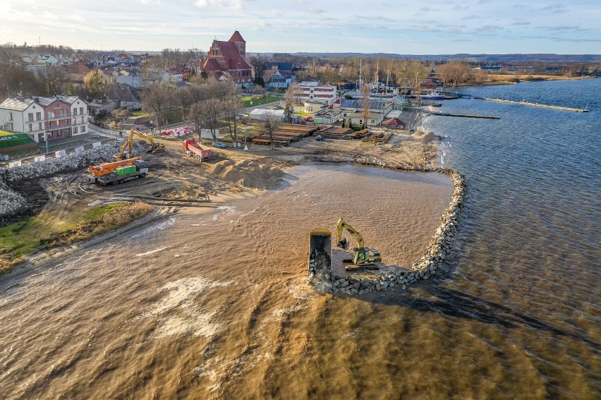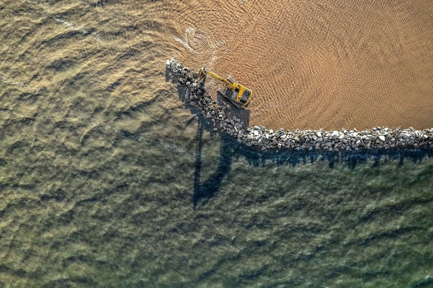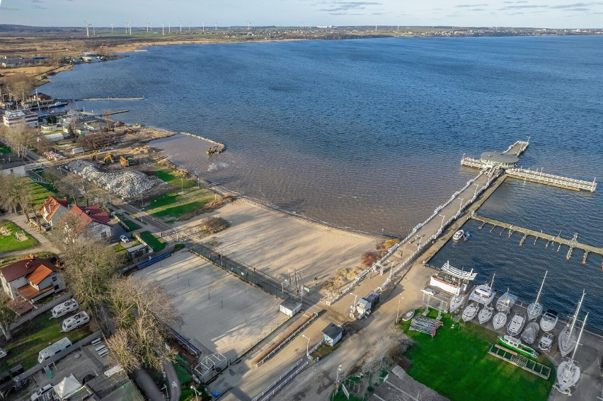 Roboty na lądzie - te widoczne gołym okiem - ruszyły pod koniec ubiegłego roku, gdy odgrodzono część plażowego terenu w Pucku, a na brzegu pojawiły się hałdy gruzu i kamieni. Teraz, w styczniu 2022 sprzęt wreszcie wkroczył do wody.