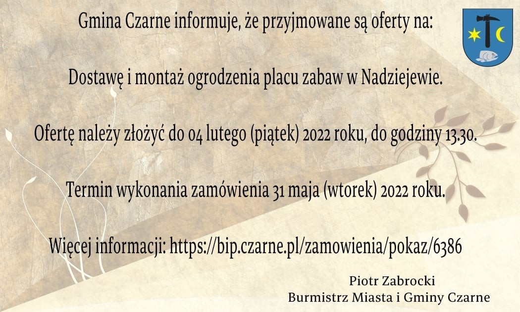 Więcej informacji: https://bip.czarne.pl/zamowienia/pokaz/6386 - 04 lutego (piątek) 2022 roku do godziny 13.30.
