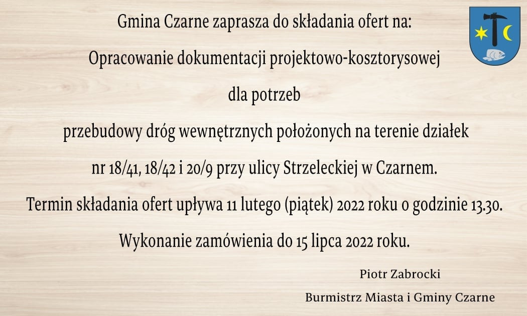 3. Opracowanie dokumentacji projektowo-kosztorysowej dla potrzeb przebudowy dróg wewnętrznych przy ulicy Strzeleckiej w Czarnem. Więcej informacjihttps://bip.czarne.pl/zamowienia/pokaz/6391 - 11 lutego (piątek) 2022 roku do godziny 13.30.