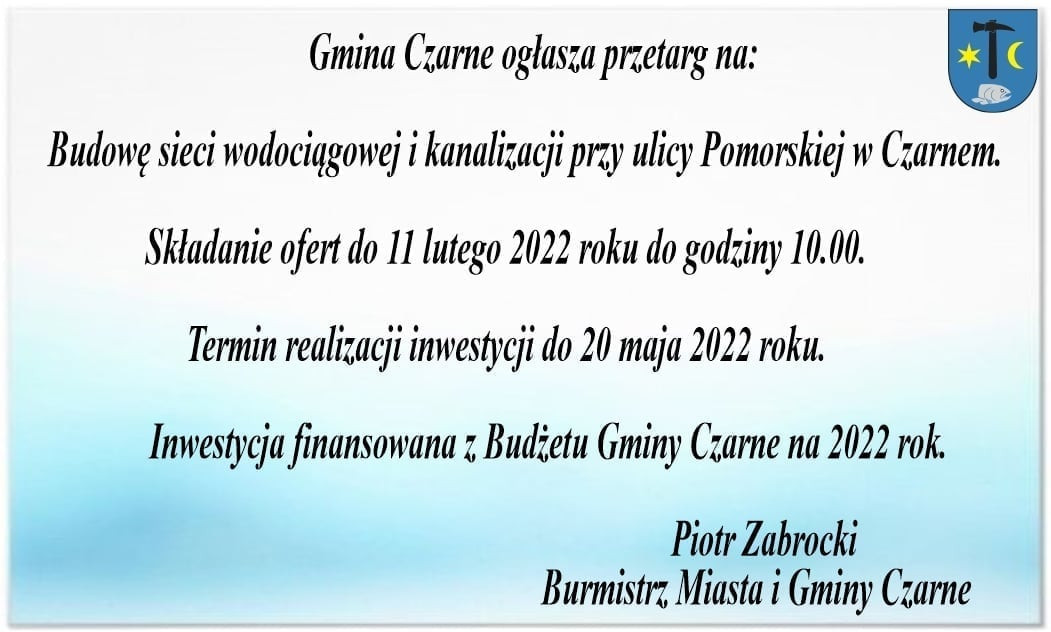 4. Budowa sieci wodociągowej i kanalizacji przy ulicy Pomorskiej w Czarnem. Więcej informacji: https://portal.smartpzp.pl/czarne/ - do 11 lutego (piątek) 2022 roku do godziny 13.30".