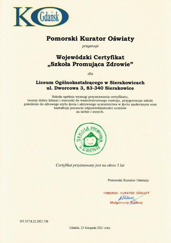 Cyt.: "(...) W ocenie koordynatora projektu działania prozdrowotne sierakowickiej placówki okazały się zgodne ze zdiagnozowanymi potrzebami społeczności szkolnej i dobrze zrealizowane. Powodem do radości jest nie tylko uzyskany certyfikat, ale przede wszystkim aktywny udział uczniów, nauczycieli i rodziców w jego zdobyciu ".