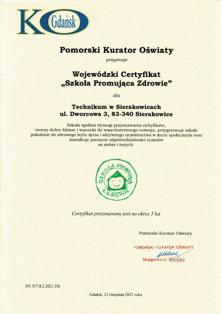 Z informacji, którą podaje portal internetowy zkaszuk.info Zespół Szkół Ponadgimnazjalnych w Sierakowicach należy do sieci placówek, promujących zdrowie w woj. pomorskim. Szkoła nie spoczęła jednak na laurach. Podjęte zostały bowiem skuteczne starania, aby zdobyć Wojewódzki Certyfikat Szkół Promujących Zdrowie. W swoim artykule portal pisze: