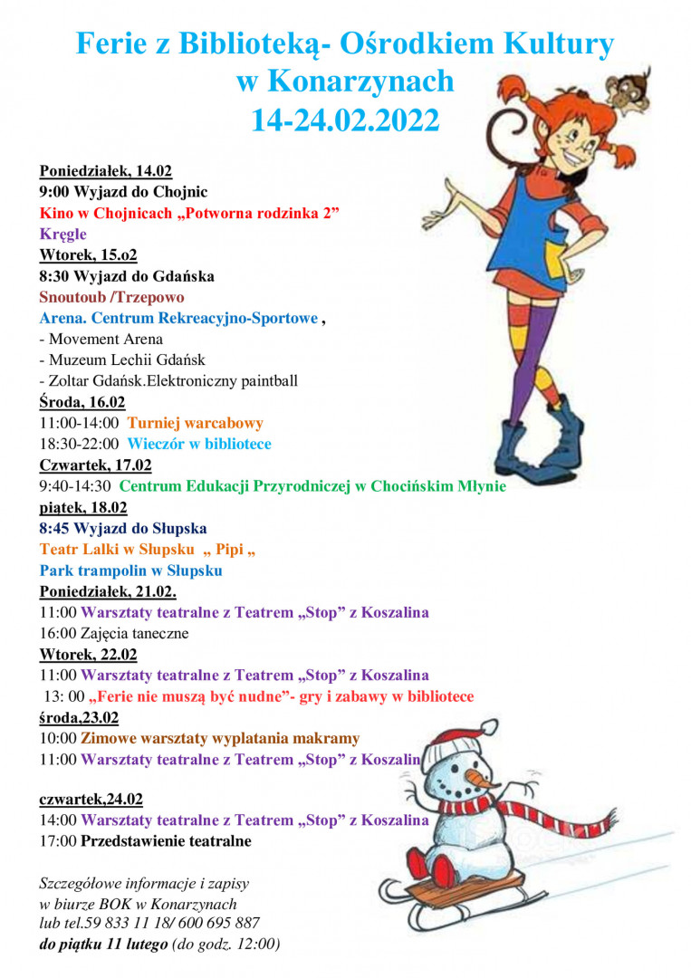 Z informacji, którą podaje portal internetowy Gmina Konarzyny do piątku 11.02.2022 r trwają zapisy na Ferie z Biblioteką - Ośrodkiem Kultury w Konarzynach. Szczegóły na plakacie.