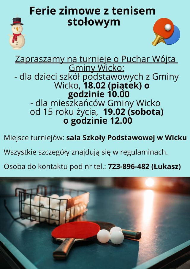 Jak podaje portal internetowy Powiat Lęborski, Gminny Ośrodek Kultusy i Sportu w Wicku zaprasza wszystkich miłośników tenisa stołowego i nie tylko, na aktywne spędzenie czasu podczas ferii zimowych 2022. W swoim artykule portal pisze: