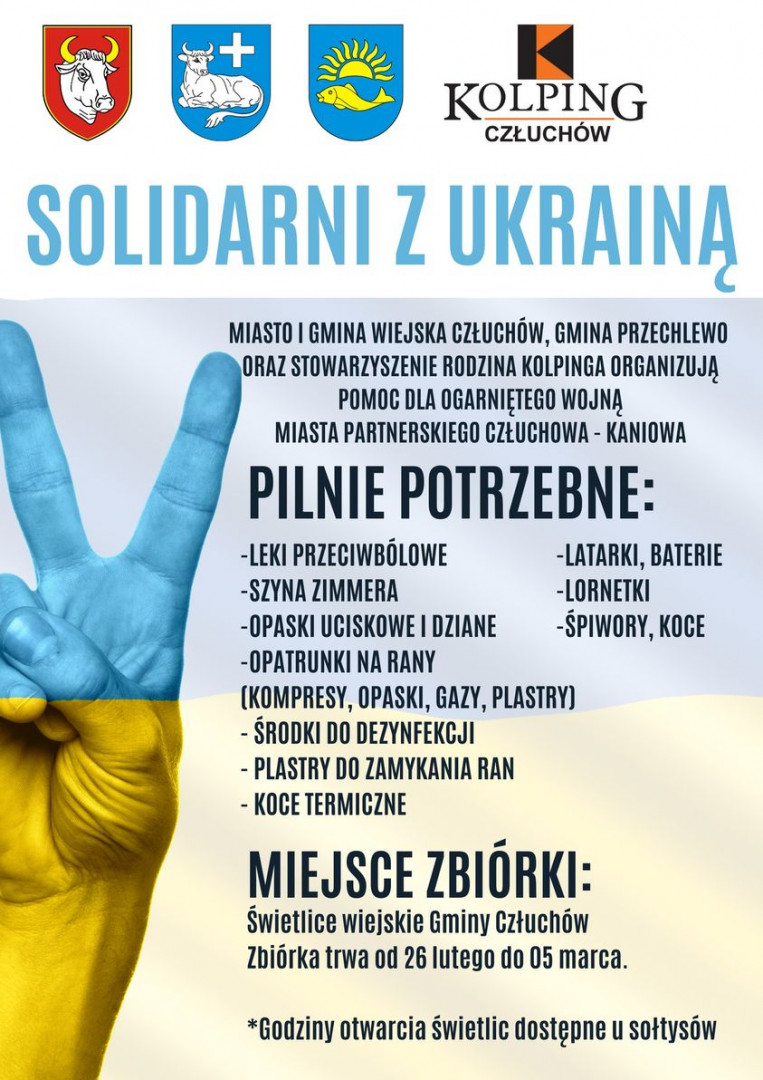 Cyt.: " W związku z sytuacją na Ukrainie, zachęcamy mieszkańców do przekazywania najpotrzebniejszych środków pomocy dla mieszkańców miasta partnerskiego Człuchowa- miejscowości Kaniowa. (...)"