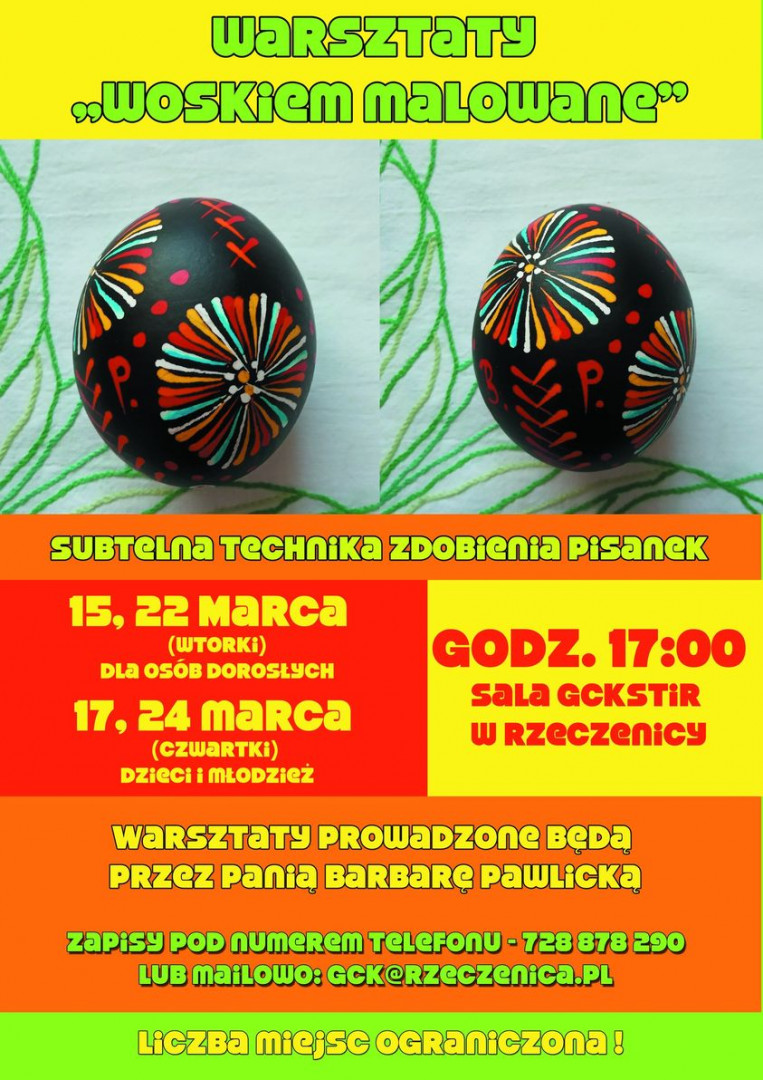 Cyt.: " Mieszkańców gminy Rzeczenica zapraszamy do udziału w warsztatach pisania pisanek pt. "Woskiem malowane". Poprowadzi je Pani Barbara Pawlicka, zdobywczyni wielu ogólnopolskich nagród za pisanki właśnie. Warsztaty będą odbywały się w dwóch grupach - dla młodzieży szkolnej oraz dla dorosłych. (...)"