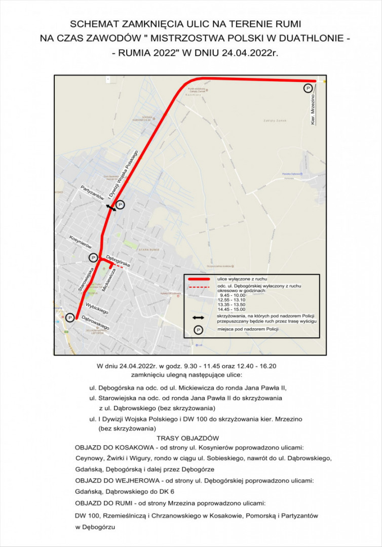 Cyt.:" Zawody będą miały miejsce już w tę niedzielę, więcej szczegółów dostępnych jest w artykule tutaj, a ulice zostaną wyłączone z ruchu już od godziny 09:30 – 11:45 oraz od 12:40 – 16:20. Zamknięciu ulegną: ul. Dębogórska na odc. od ul. Mickiewicza do ronda Jana Pawła II, ul. Starowiejska na odc. od ronda Jana Pawła II do skrzyżowania z ul. Dąbrowskiego (bez skrzyżowania) oraz ul. I Dywizji Wojska Polskiego i DW 100 do skrzyżowania kier. Mrzezino (bez skrzyżowania).(...)"