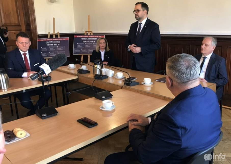 Cyt.:" W kościerskim Starostwie Powiatowym spotkali się samorządowy z naszego powiatu. Celem spotkania było podpisanie umów na dofinansowanie inwestycji drogowych, które otrzymały wsparcie finansowe z budżetu państwa. Wziął w nim udział Marcin Horała, sekretarz stanu w ministerstwie infrastruktury oraz Dariusz Drelich, wojewoda pomorski. Najwięcej pieniędzy, bo prawie 7 mln zł wpłynie do kasy powiatu kościerskiego, który z otrzymanych środków ma zamiar przebudować drogę od Liniewa do Starych Polaszek o długości ponad 6 km oraz drogę powiatową od drogi wojewódzkiej nr 221 do Starego Barkoczyna. Remontowany odcinek będzie miał długość prawie 5 mln zł.